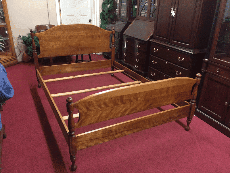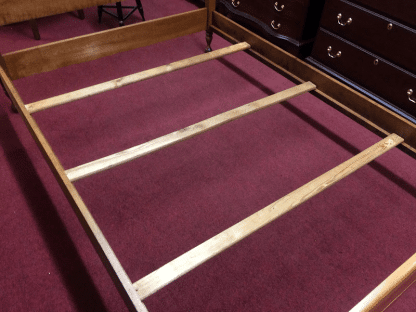 Of course, this vintage bed was made during the days of Vermont Maple Ethan Allen. It features a lovely headboard and footboard. Of course, it has wooden side rails and slats as well.