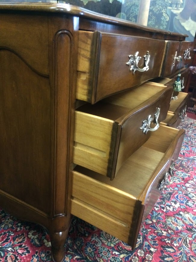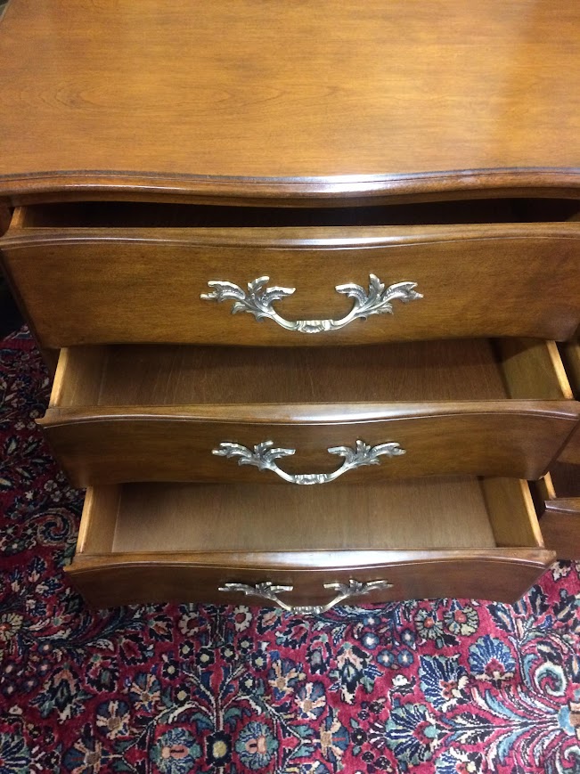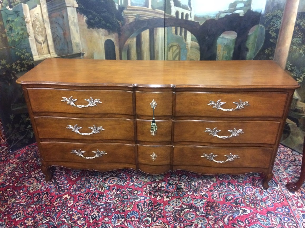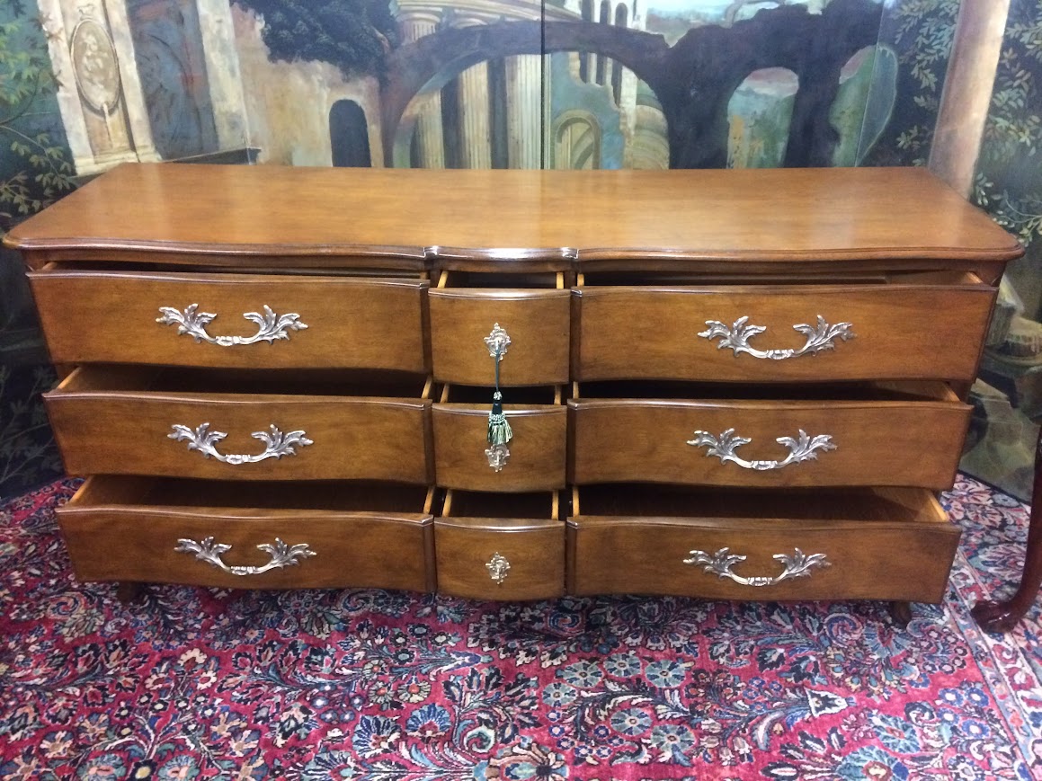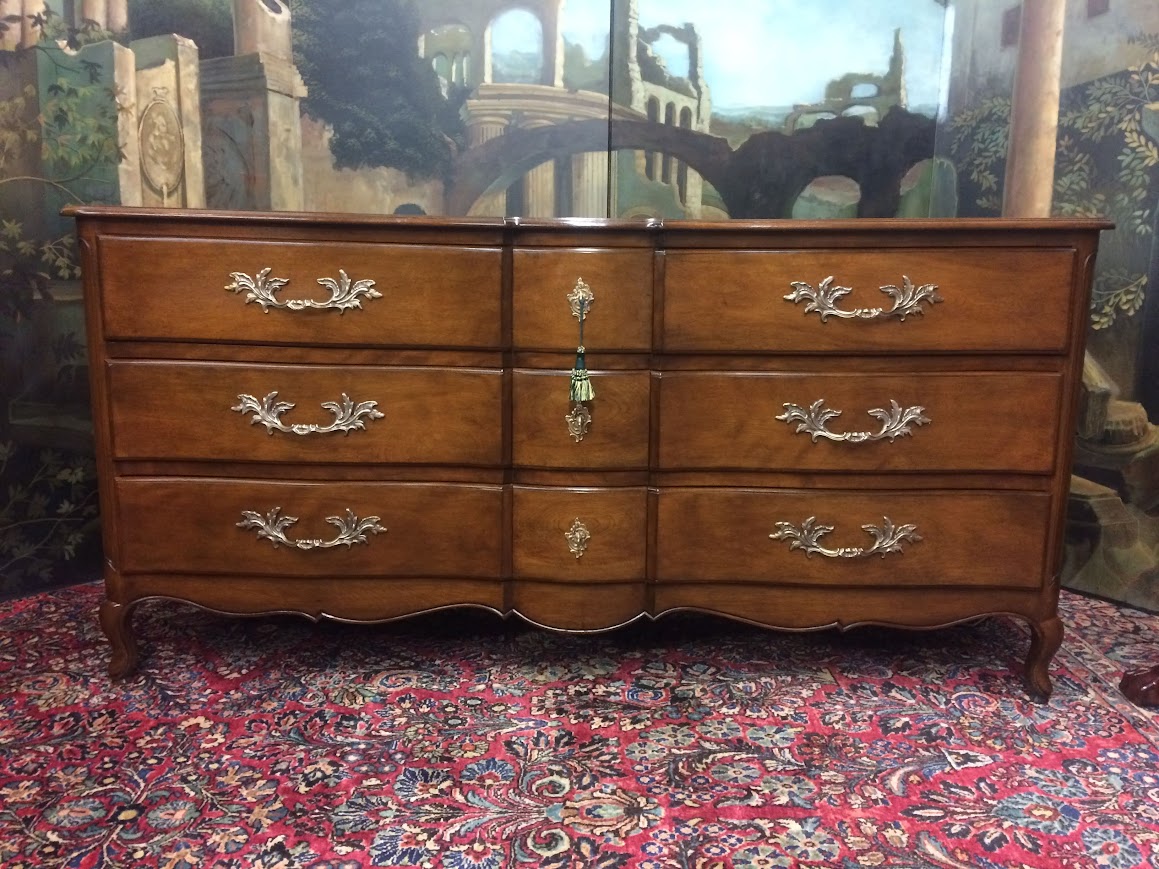 This nice vintage French style dresser has a beautiful triple drawer design. It features serpentine front drawers, with two wider banks of drawers on either side and a narrow set in the center.