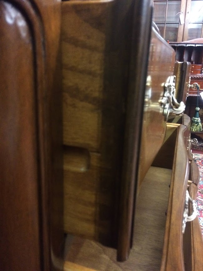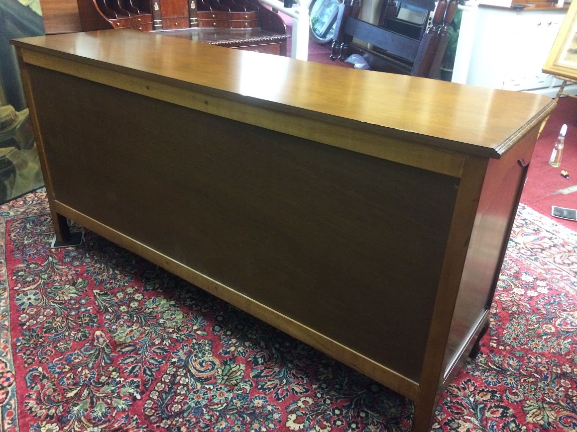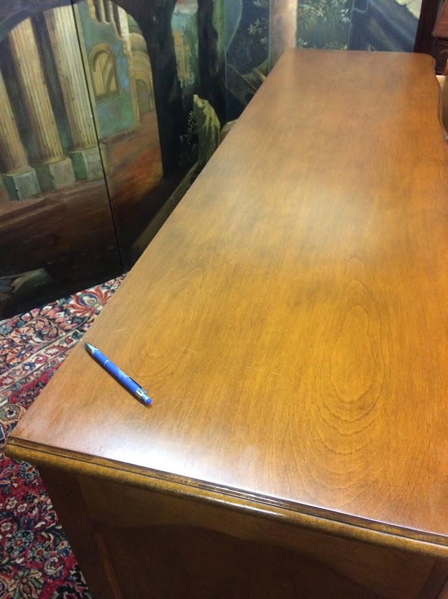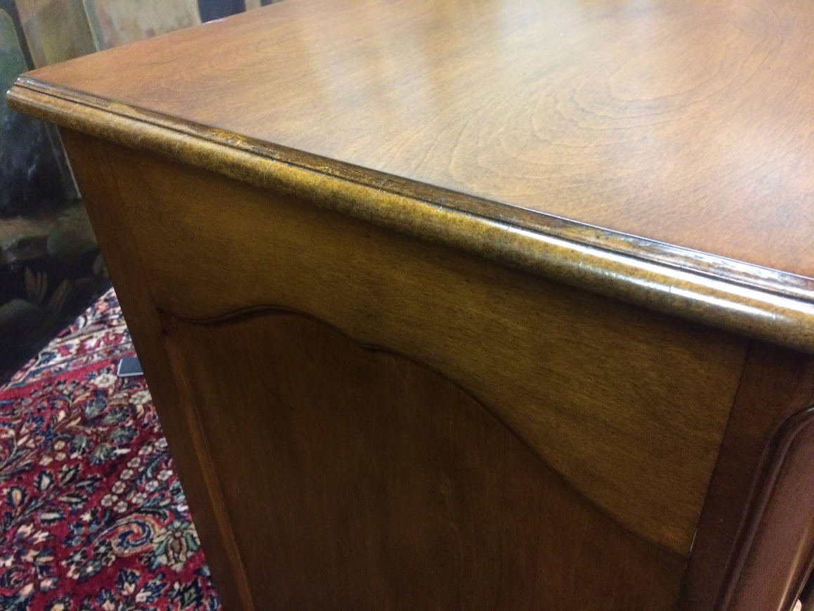 This high end dresser has a great look and is in the original finish. There are a few light blemishes towards the back of the dresser on the top. Additionally, there is light separation marks on the side trim. Please see photos.