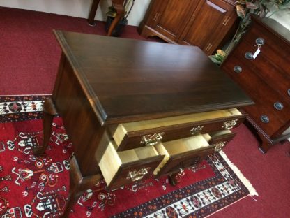 The vintage Harden lowboy features brass hardware. Also, it has nice tall Queen Anne legs. Finally, the chest features a beautiful Georgian style shell carving.