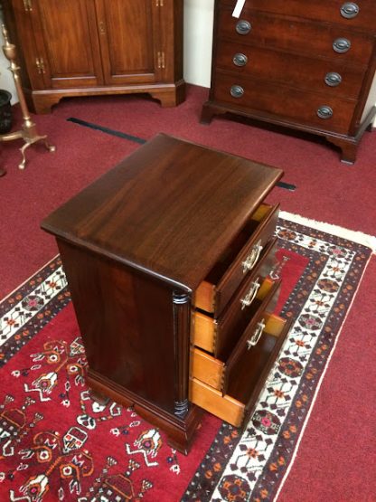 Of course, the nightstand features solid mahogany, and has the vintage red label proving the grade. Also, it has four small drawers. Each drawer features brass hardware. Additionally, the nightstand has a fluted column on either side. Finally, it has bracket feet.