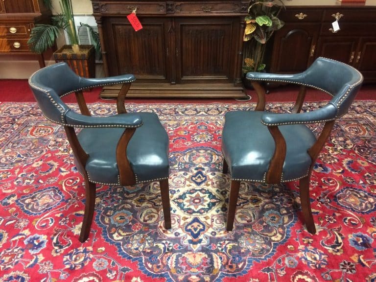 Of course, the leather arm chairs have a very pretty dusty blue leather. Also, they have silver tacks around the edges. Additionally, the chairs have a solid cherry frame.
