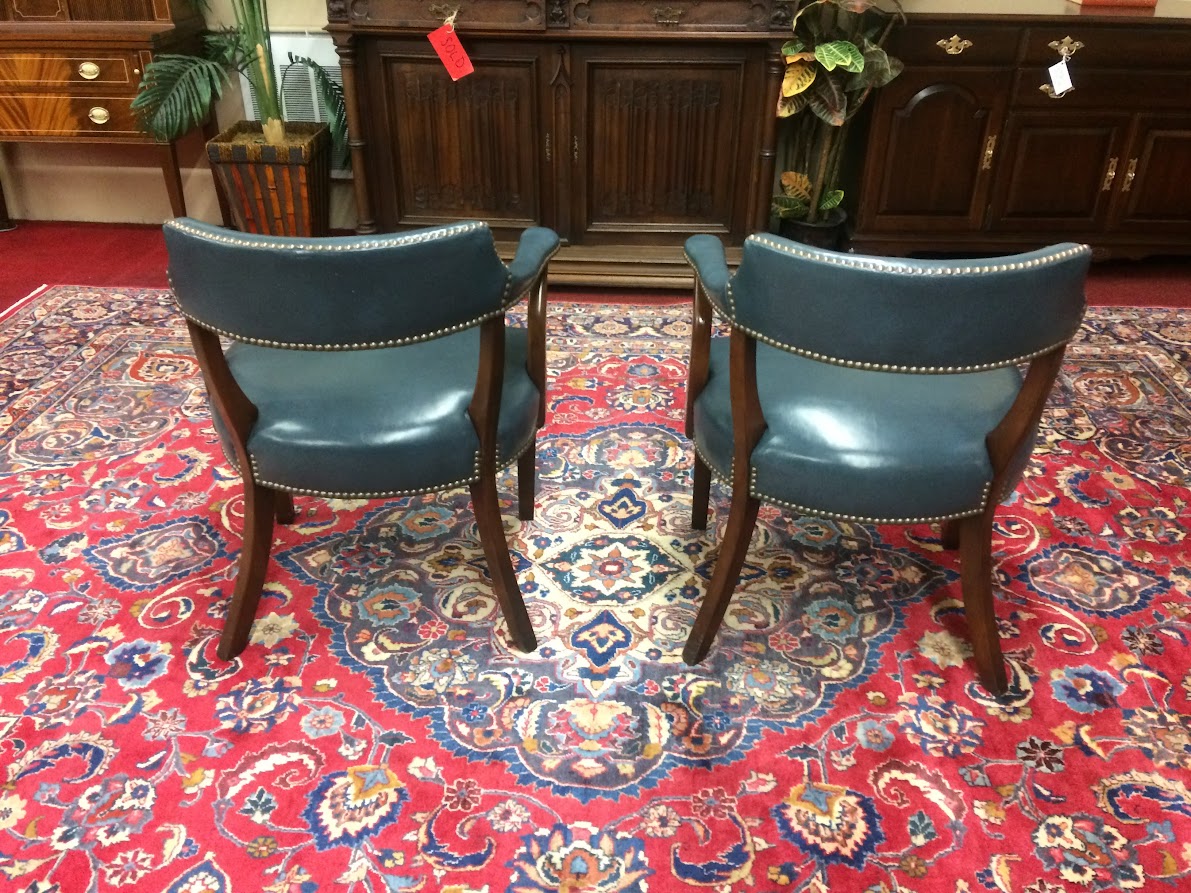 Nice vintage leather arm chairs with a pale blue leather. These stylish banker-style chairs are perfect for an office, waiting room or sitting area.