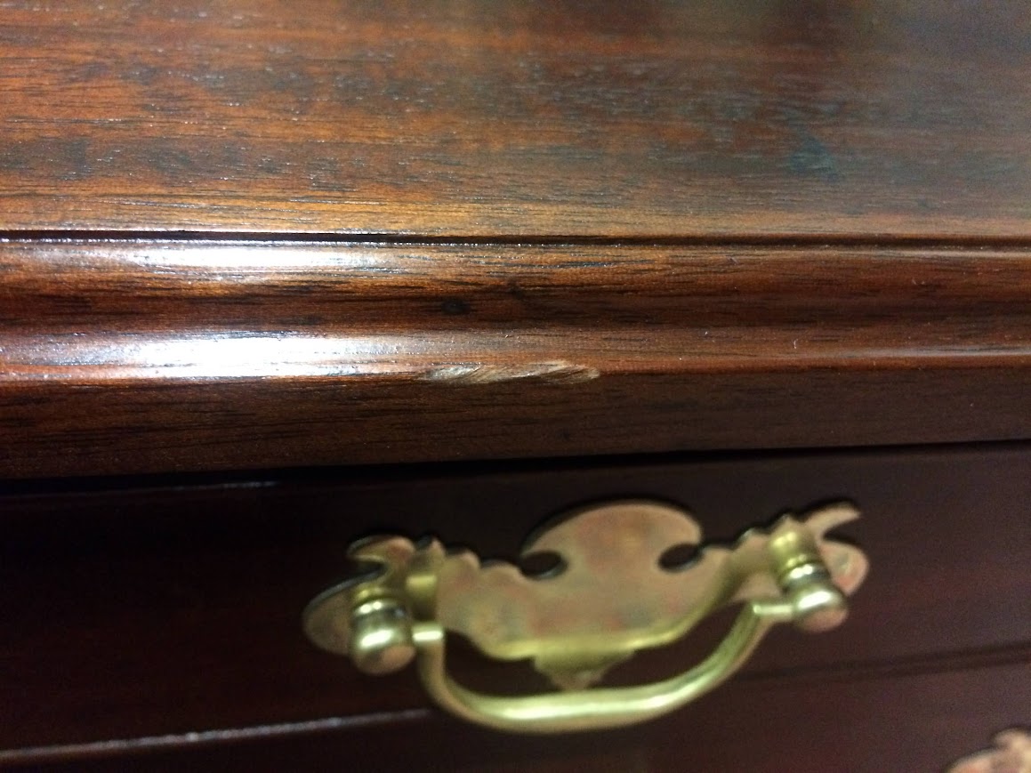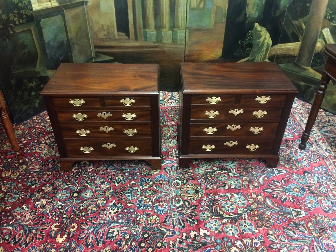 We refinished this pair of nightstand chests in order to bring out the beauty of the mahogany grain. They show well and have a beautiful look. That said, one chest has a couple small blemishes, including a few rubs and a small crack that was repaired. Please see photos.
