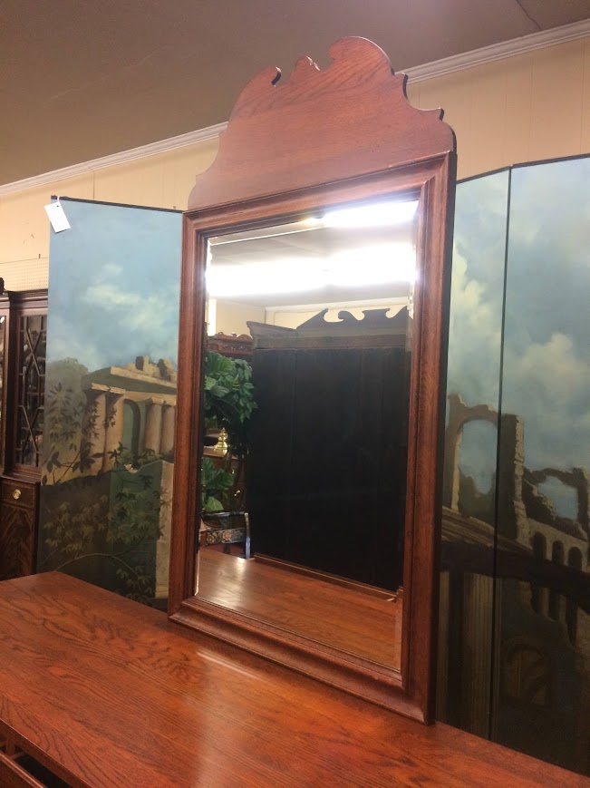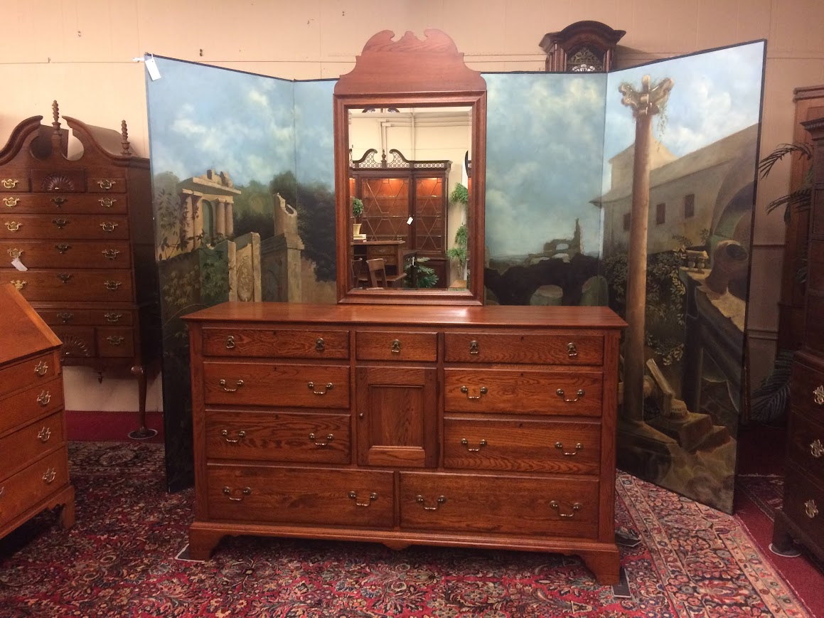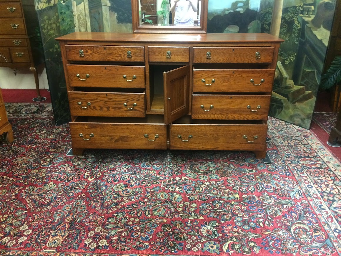 This nice vintage oak dresser with mirror has an incredible amount of storage. It is nearly 70″ long and has a total of nine drawers and one cabinet door. Of course, each drawer features a pewter colored hardware, in a traditional swan neck design.