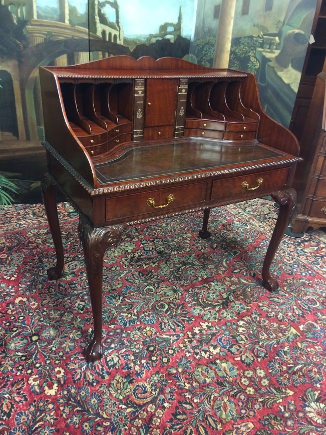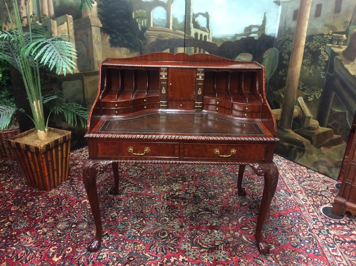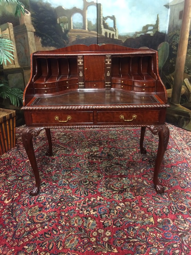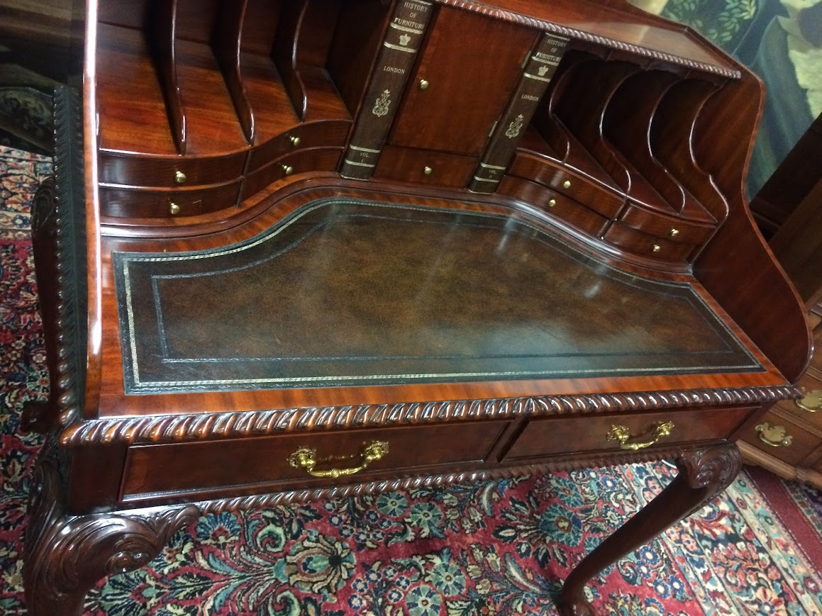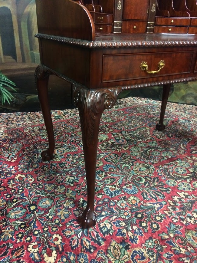 Finally, the desk features two lap drawers, with brass hardware, rope carved edges and beautiful ball and claw feet. This desk really deserves to be a focal point in a room!