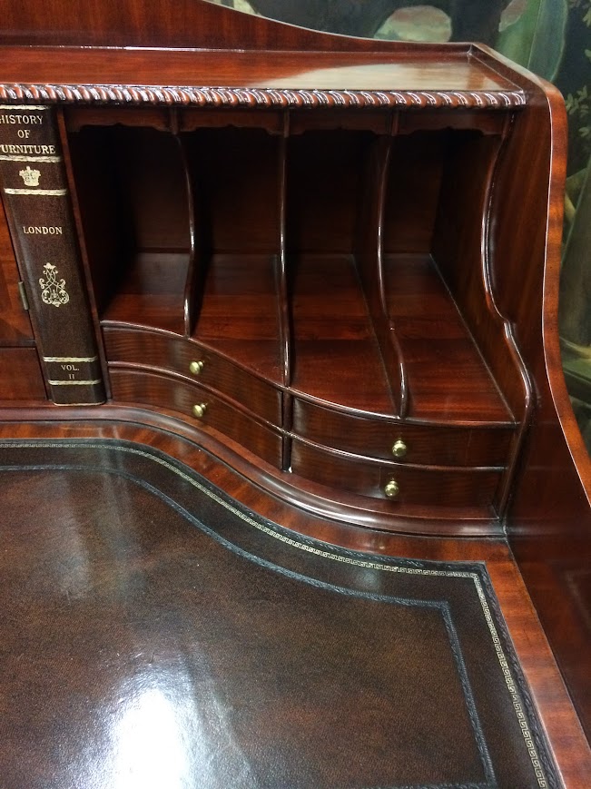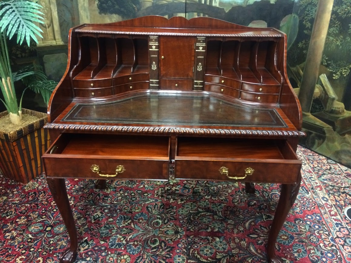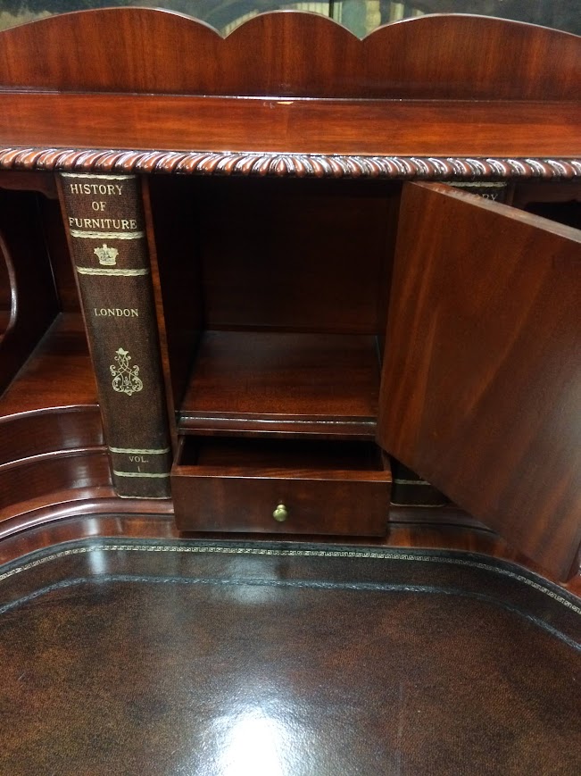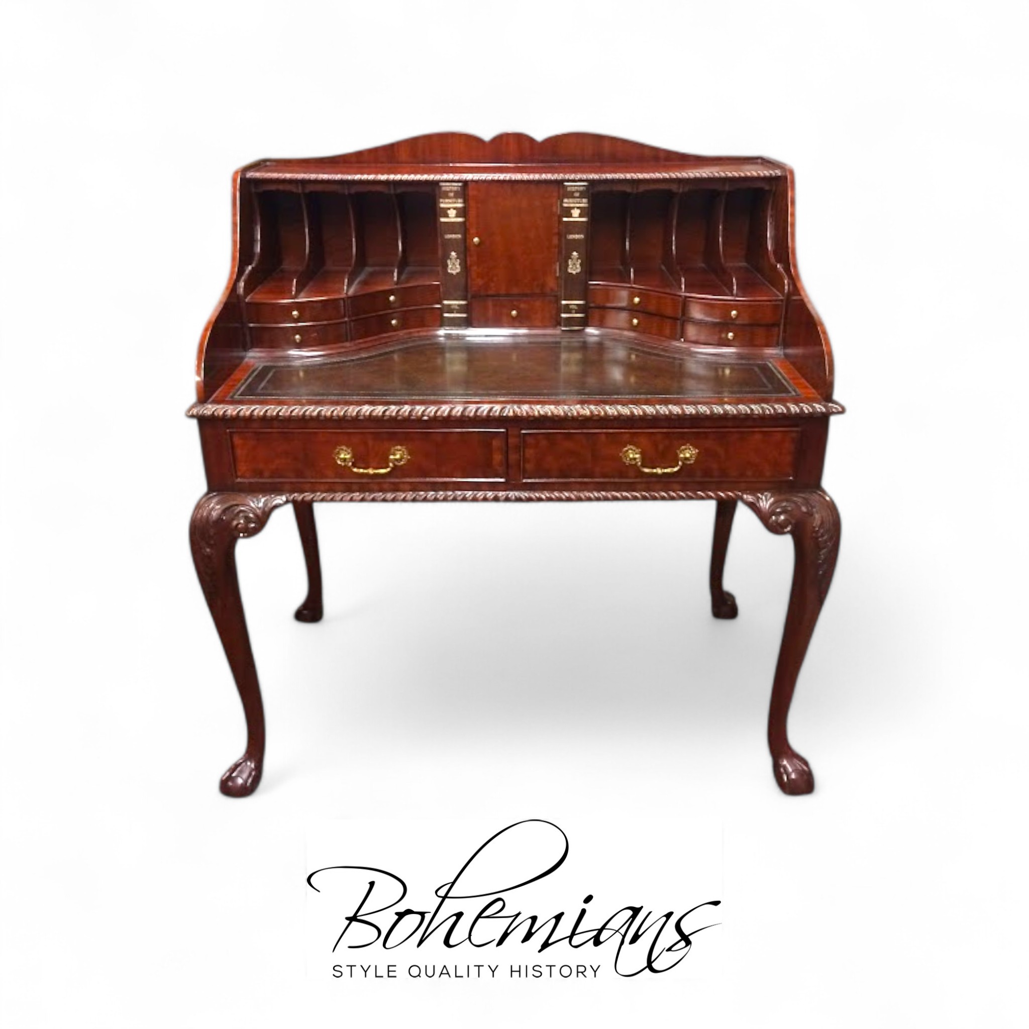 Finally, the desk features two lap drawers, with brass hardware, rope carved edges and beautiful ball and claw feet. This desk really deserves to be a focal point in a room!