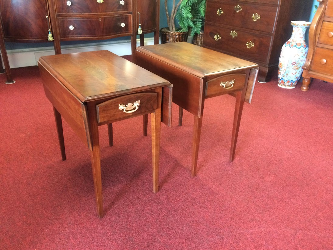 Of course, these vintage Pembroke end tables have drop leaf sides. Also, they have one shallow drawer. Finally, the end tables have straight legs.