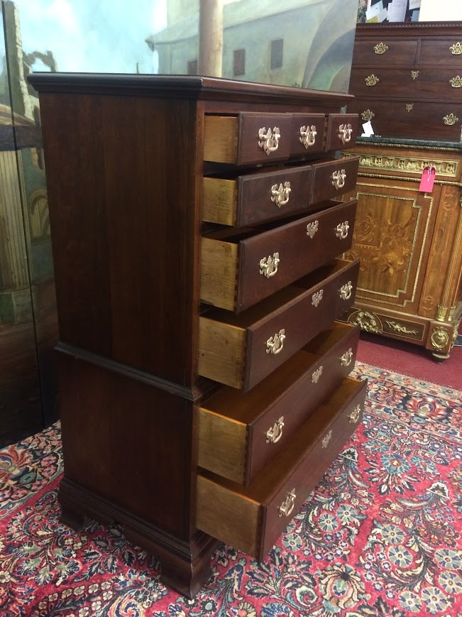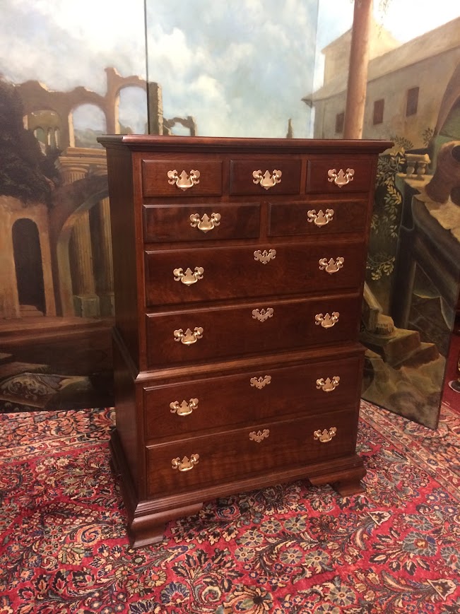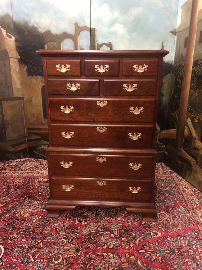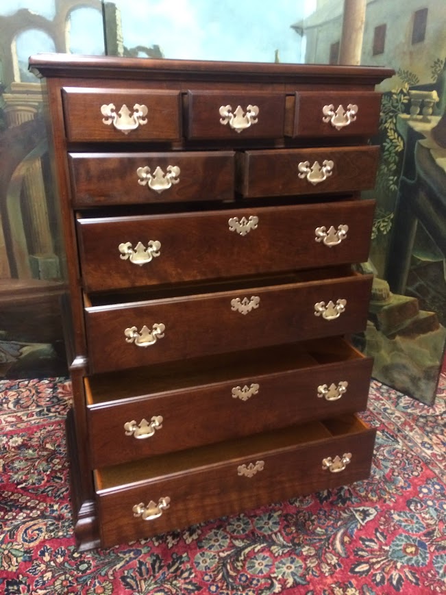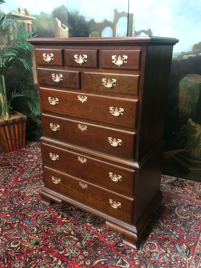 This nice Cherry tall chest is in good shape. It shows well and has a good look. We refinished the chest and polished the original hardware. That said, there is a little finish damage on the left foot. Please see photos.