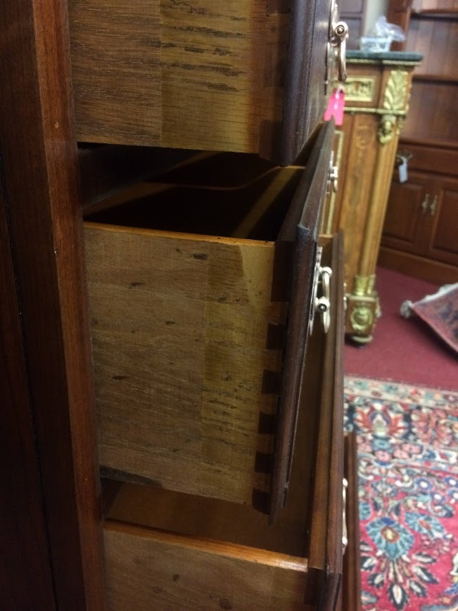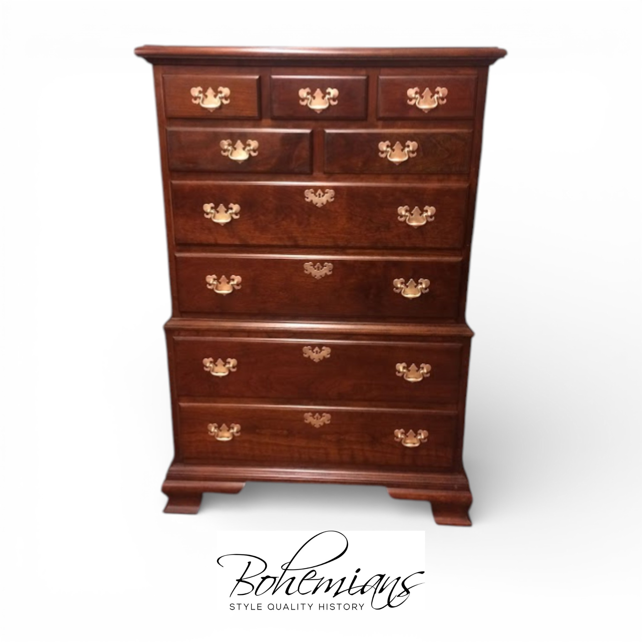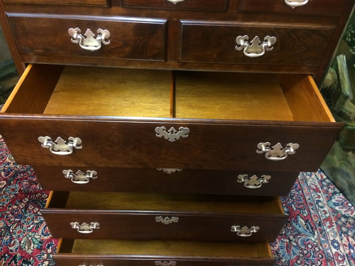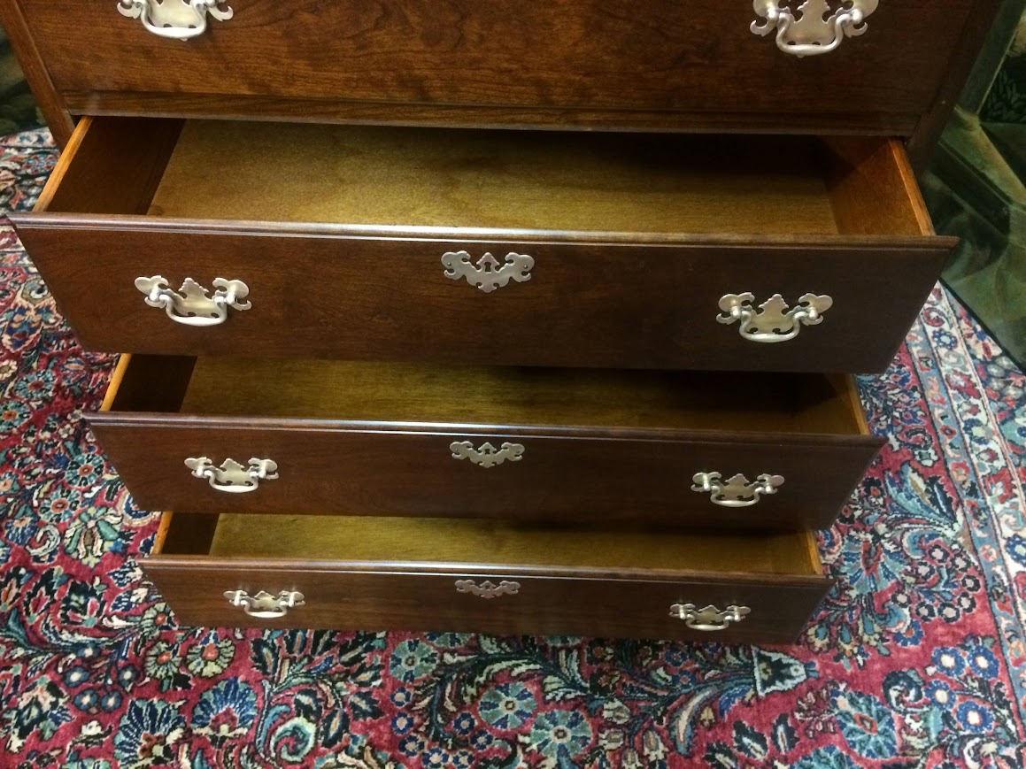 This nice Cherry tall chest is in good shape. It shows well and has a good look. We refinished the chest and polished the original hardware. That said, there is a little finish damage on the left foot. Please see photos.