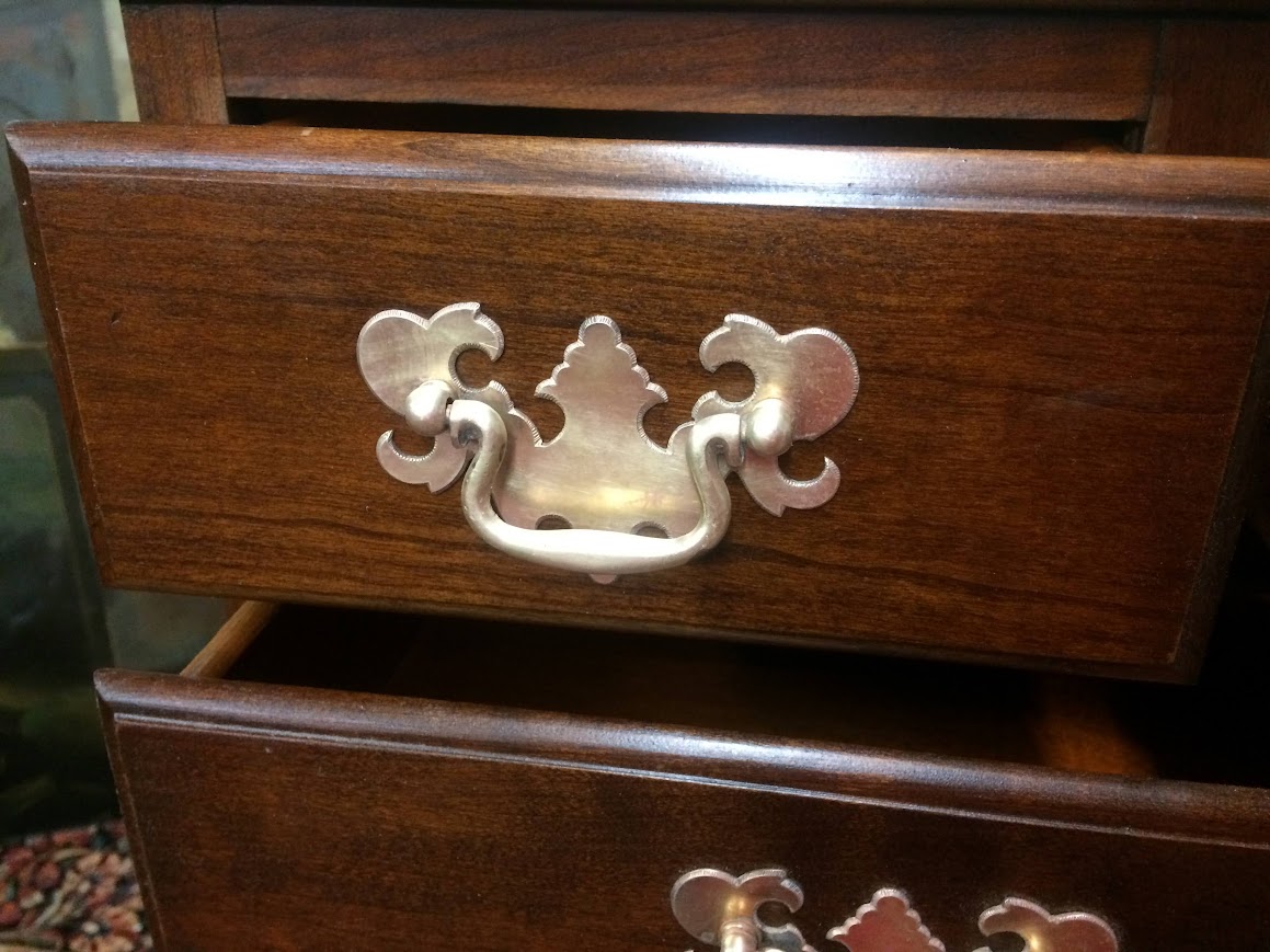 Then, at the base are two wider and deeper drawers. The chest sits on bracket style feet. Of course, it has nice brass hardware, which suits the traditional style well.