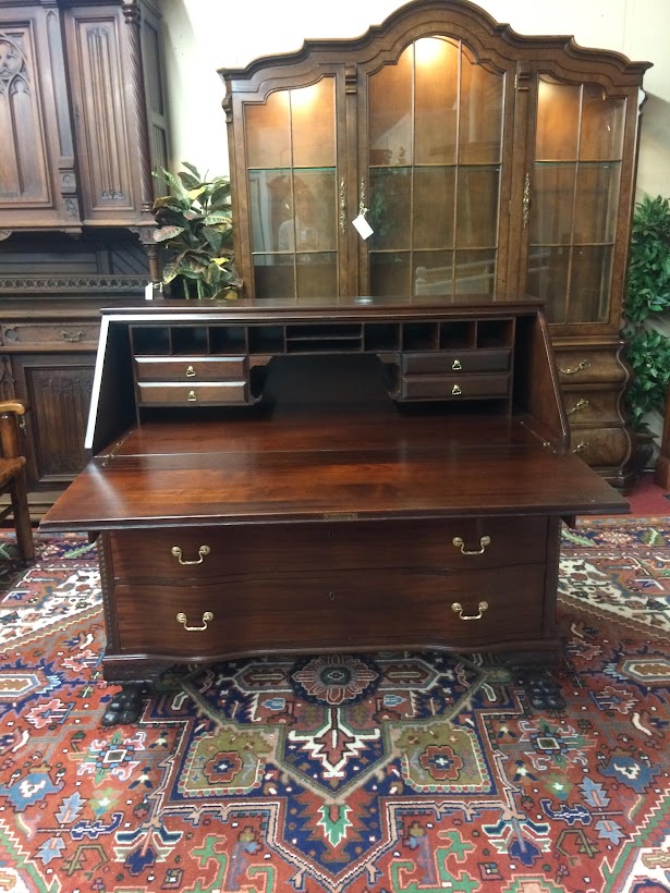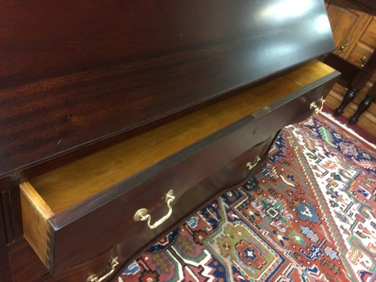 Also, the desk features a softly undulating serpentine front. So, the drawers have a nice wave to them. Finally, the secretary desk has a nicely designed interior. You will find lots of open cubbies as well as small drawers. It even has a nice pencil drawer on either side.