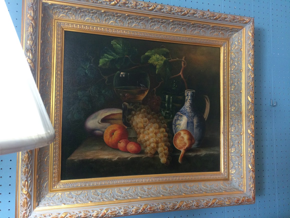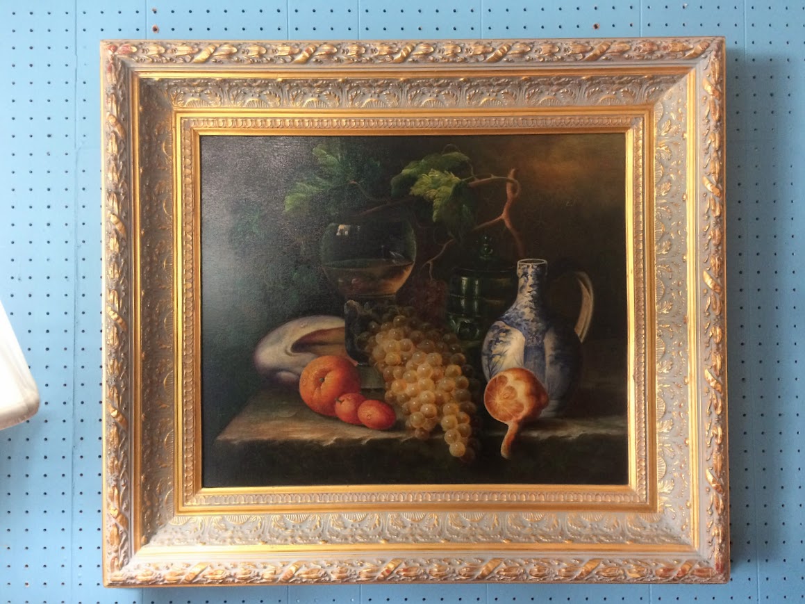 Nice vintage still life painting, done in an Old World style. This traditional framed artwork has beautiful rich colors and a lovely gilded frame.