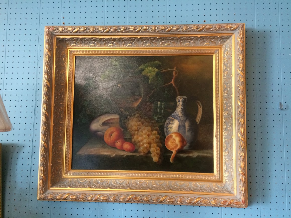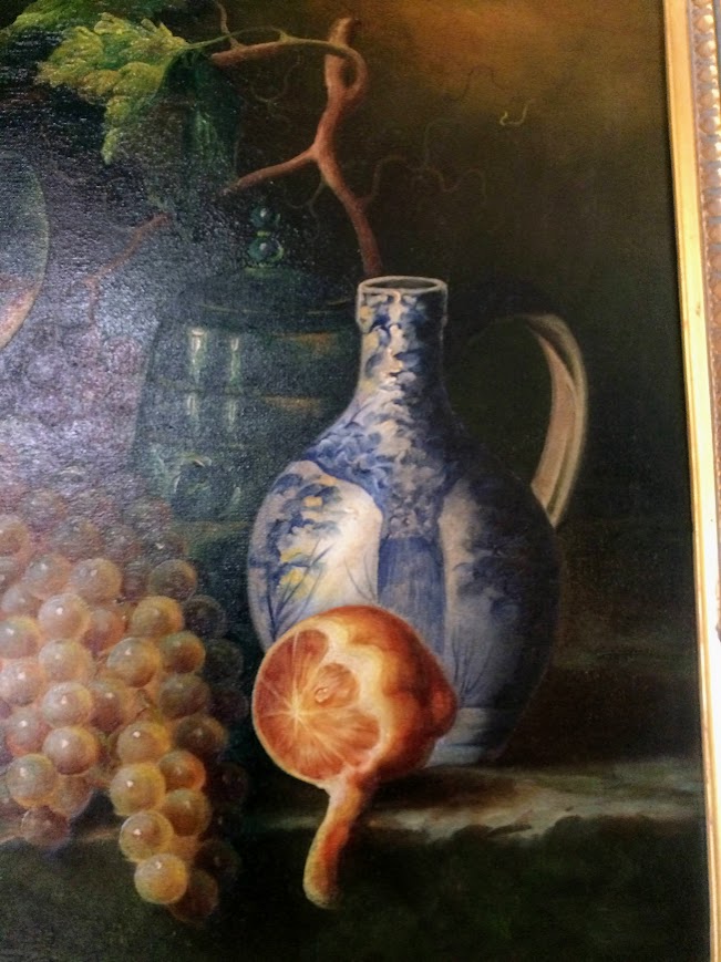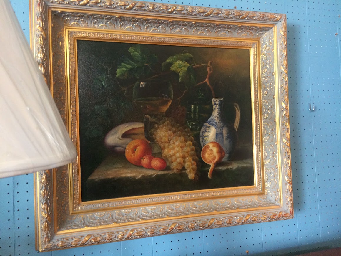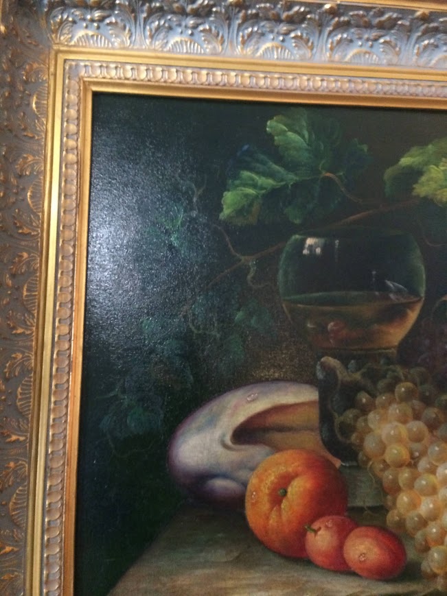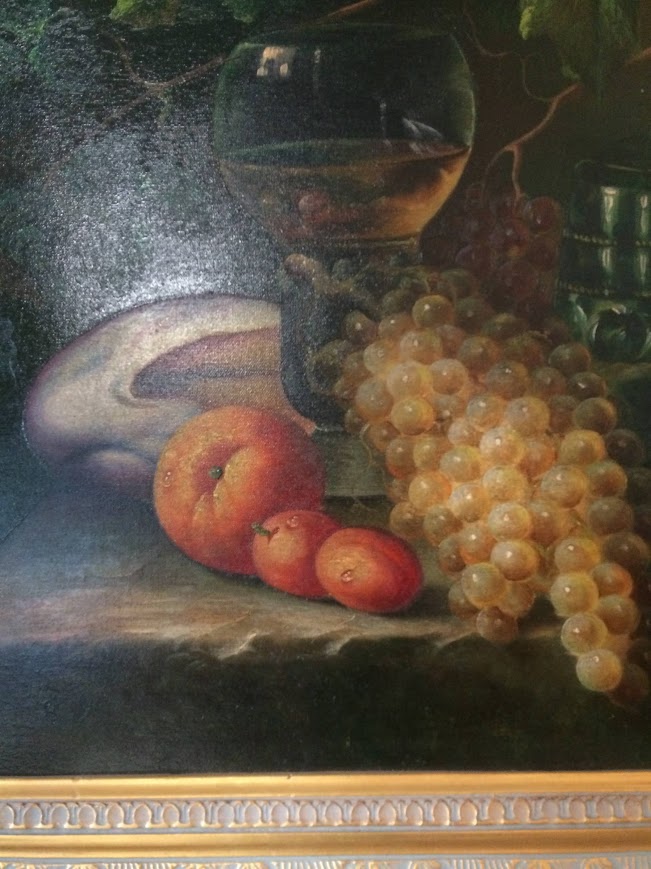 This lovely vintage still life painting features a lovely tableau of fruit, wine, fish and glass and fine ceramics. Of course, the dark background recalls the Dutch tradition of still-lifes, and gives a nice depth.