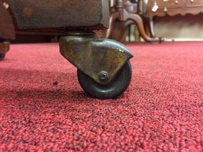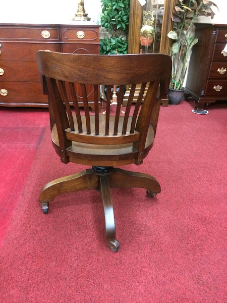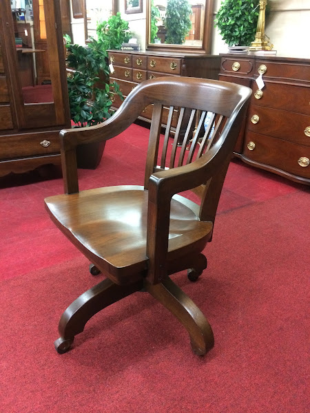 Vintage Wooden Desk Chair with heavy cast iron base and wheels. This nice looking wooden chair shows great quality.